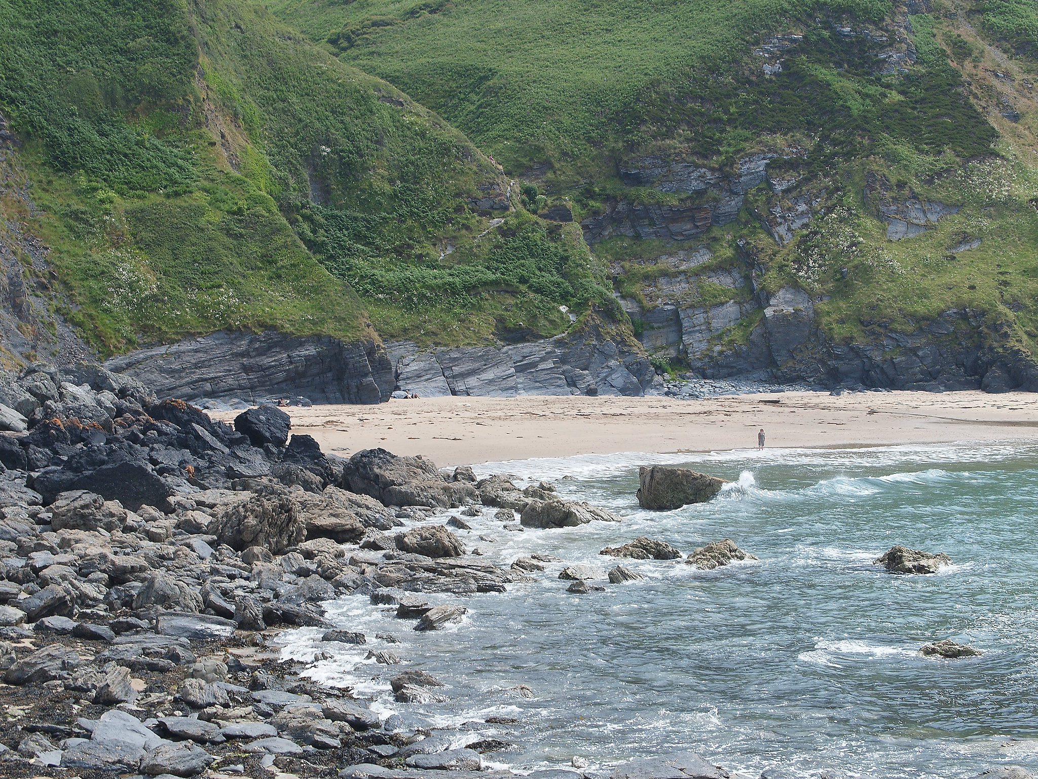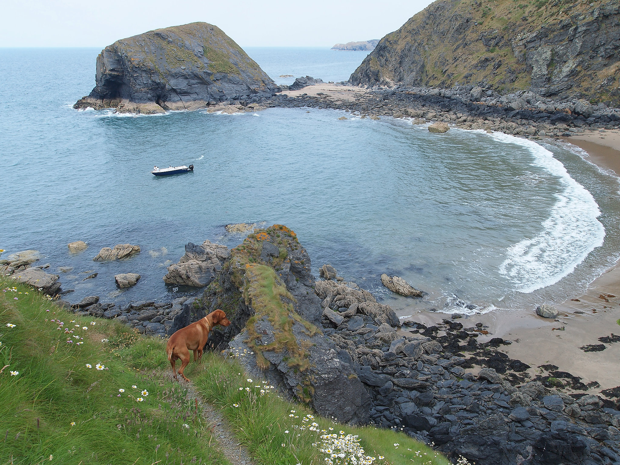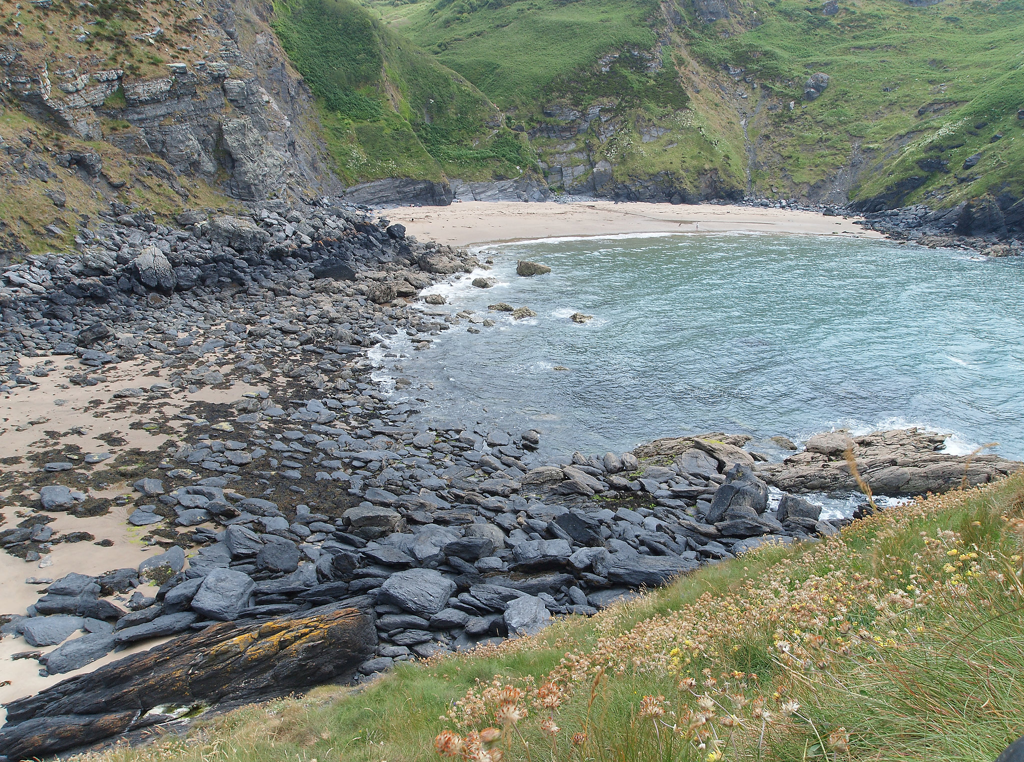Traeth Bach lies between Penbryn and Llangrannog. A headlands walk on the coastal path followed by a scramble down to the beach complete with an island and a cave.