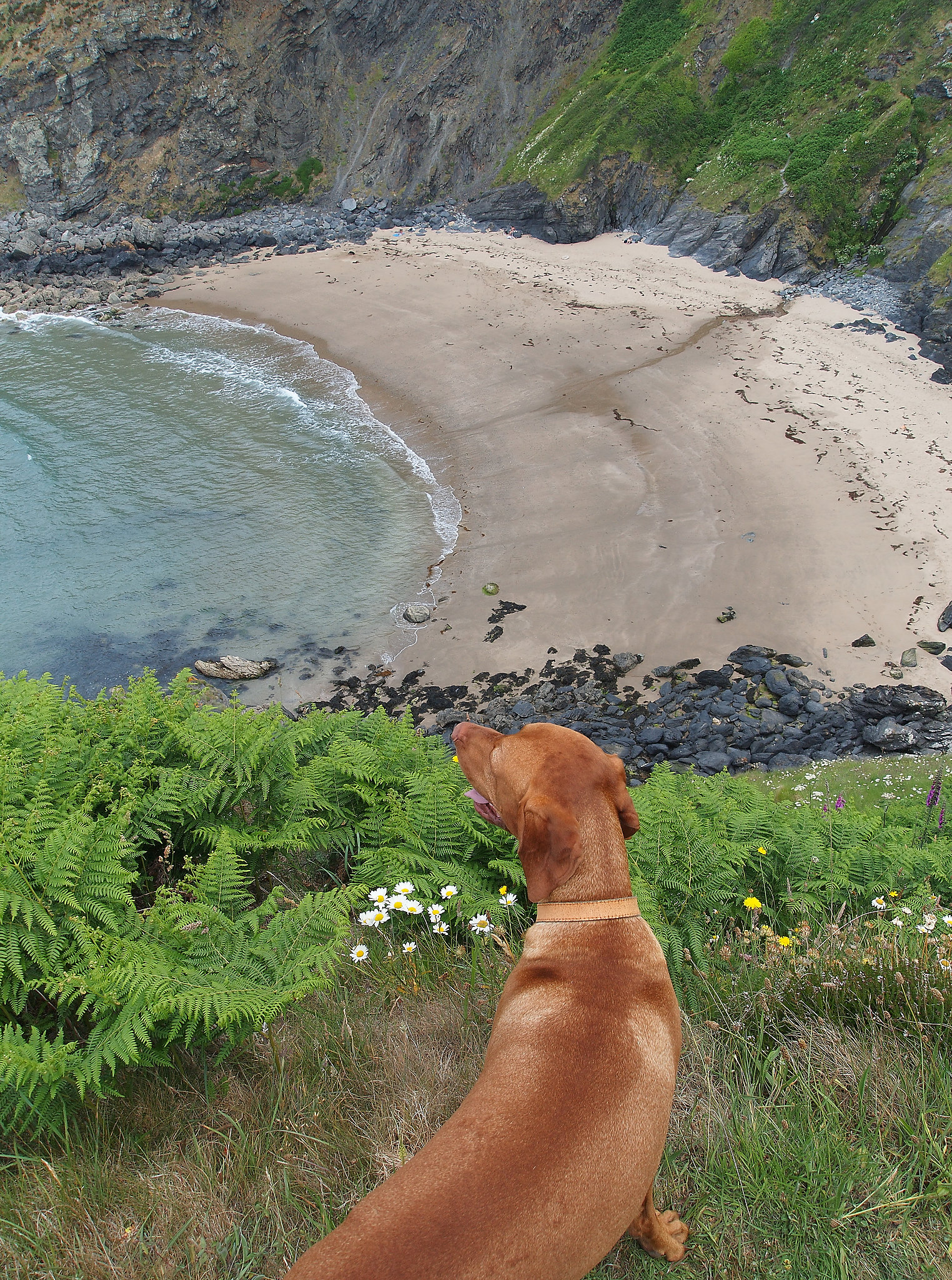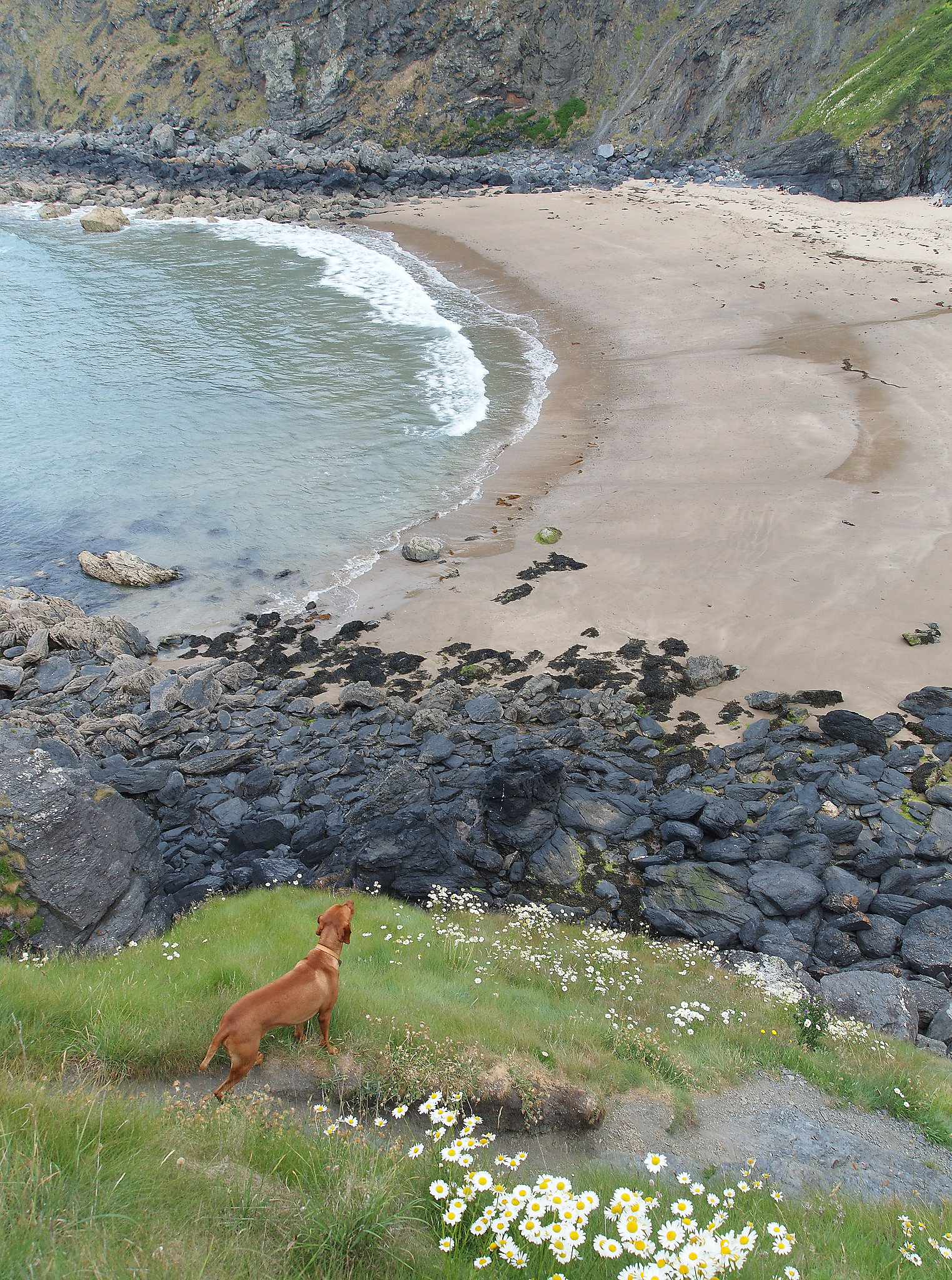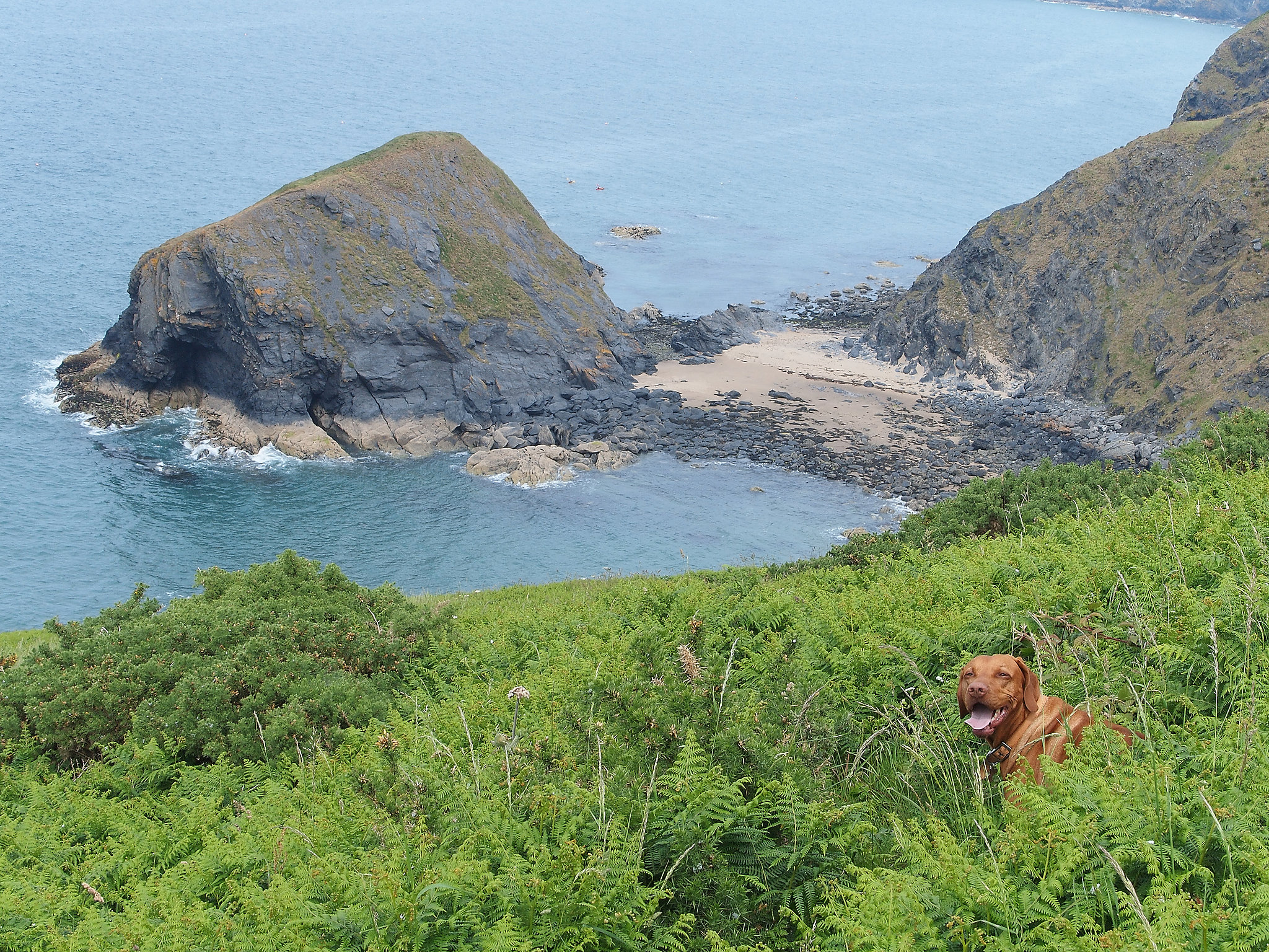 Traeth Bach lies between Penbryn and Llangrannog. A headlands walk on the coastal path followed by a scramble down to the beach complete with an island and a cave.